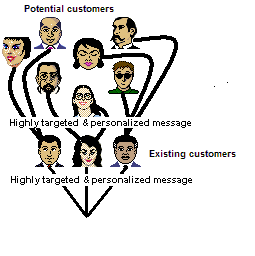 - Viral marketing harnesses highly targeted and personalized communication with existing customers (because it is much easier to query them about, and note their preferences), who are motivated to recommend the message to family, friends and acquaintances, again through highly targeted and personalized communication (the referrers tailor the message), thus leveraging relationships of trust