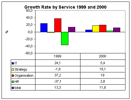 These figures indicate that IT- and organisational consulting fuelled growth in 1999. This was driven by the current developments in the IT-sector. The BDU names year 2000 solutions, Euro-implementations, SAP implementations and e-business activities. These changes in the customers' environment change their industries more or less and hence create enormous needs for consulting. Without the impact of Y2K and Euro-implementation, the growth of IT consulting slowed down in 2000. However, this sector remains the most important field of consulting with 43.4% of total consulting revenues in 2000. The BDU predicts, that the proportion of consulting projects that include at least partly some e-commerce consulting, will grow from 38% in 2000 to about 50% in 2001..