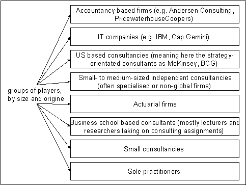 In recent years the industry has seen the entry of many non-traditional consultants into the market. Barriers to entry are considerably low with little investments into fixed assets needed. In addition – on the contrary to the auditing business – there are no legal regulations limiting the entry to this profession. Many former employees of large consultancy firms or senior managers from other businesses start up as sole practitioners or small consulting firms. On the other hand, many companies from outside the consulting industry enter this market. These are mainly IT-companies as IBM or Cap Gemini, but also designers, technologists, marketing agencies, employment agencies and others.