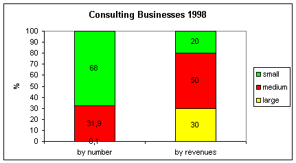 This is an ongoing trend. By 2000 the market share of large consultancies has risen to 47%, share of medium sized firms fell to 36% and share of small firms fell to 17%. This is because large firms show by far the highest growth rates with an average of 18% in 2000. Medium and small firms grew by an average of 9% and 2.5% only.
